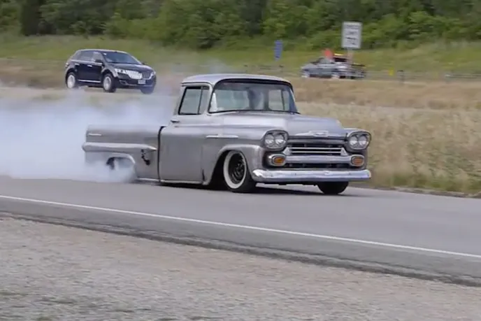 We stumbled on a YouTube video from a group called Hot Brass and Bullets. The gun thing makes us freeze in our tracks every time, but this one caught our eyes for a different reason. The video featured a pretty clean looking 1958 Chevy Apache Fleetside with twin turbos.