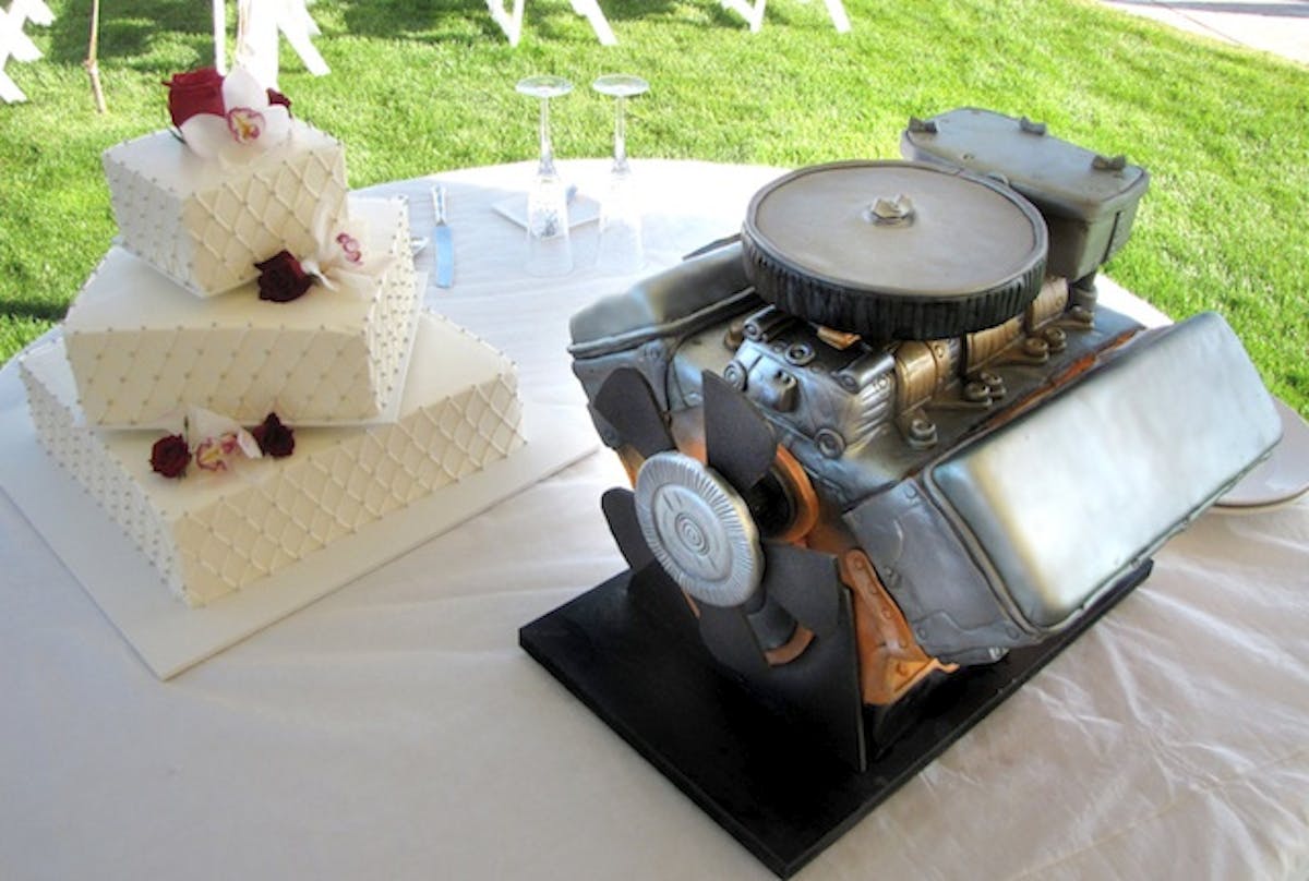 Elizabeth ended up with a near life-sized engine, weighing over a 100 pounds. This german chocolate and yellow cake with fudge filling was true to the model used. To keep the cake lighter, Elizabeth used rice cereal on the headers, air filter and other parts that she claimed not to know the names of. Anyone that can produce that amount of detail certainly knows more about engine parts than she is letting on.
