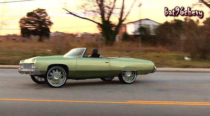 For those of you who like your cars on a set of big ass rims just as much as you like them running massive motors, then have we got the sled for you. This Donk ’73 Caprice convertible was seen this last December, pulling out of a parking lot in Orangeburg, South Carolina. The perfect blend of motored out muscle and canvas paint, this convertible is running a 572 big-block that’s loping like it should be in a Chevelle.