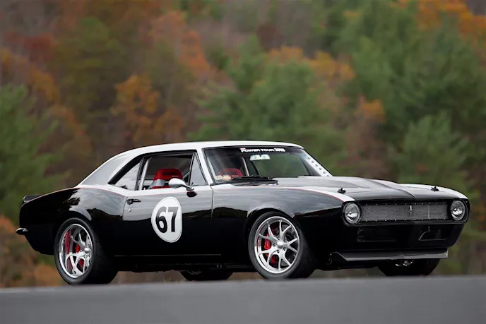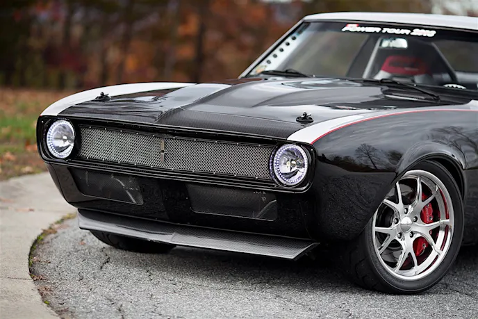 To lighten up the heavy American classic, the Camaro had its front and rear spoilers, hood, cowl, header panel, inner fenders, fender braces, trunk lid, radiator support, door sills, dash and console all removed and replaced with pieces made of carbon fiber. The exterior features a Black and Titanium Silver PPG paint that pops from any angle. Even the number 67 on the door is vinyl, and completely removable.