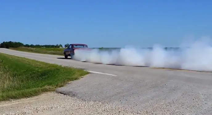 He steps on the brake, steps on the gas, and proceeds to remove a thousand miles from the rear tires in exuberant fashion. The tires lose traction with ease, an indication of what’s under the hood. After letting car sit in place for a few seconds and developing a nice cloud of white tire smoke, he eases off the brakes so the car moves forward. This allows a big trail of white smoke to follow the Chevelle, just like a steam locomotive taking off from the train station.