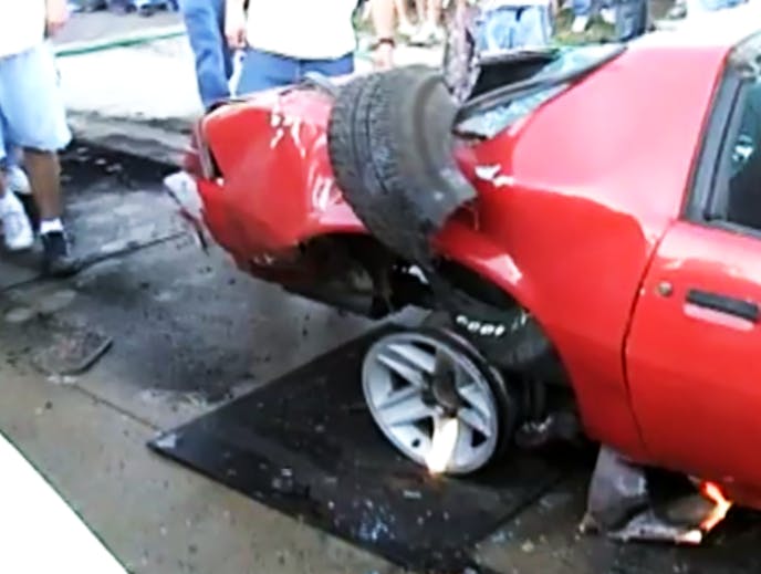 The driver gets the front tires strapped down and immediately starts to do a pretty pathetic “One Wheel Peel”. Right as the official is waving him to shut it down, the right rear tire explodes destroying the back of the car.