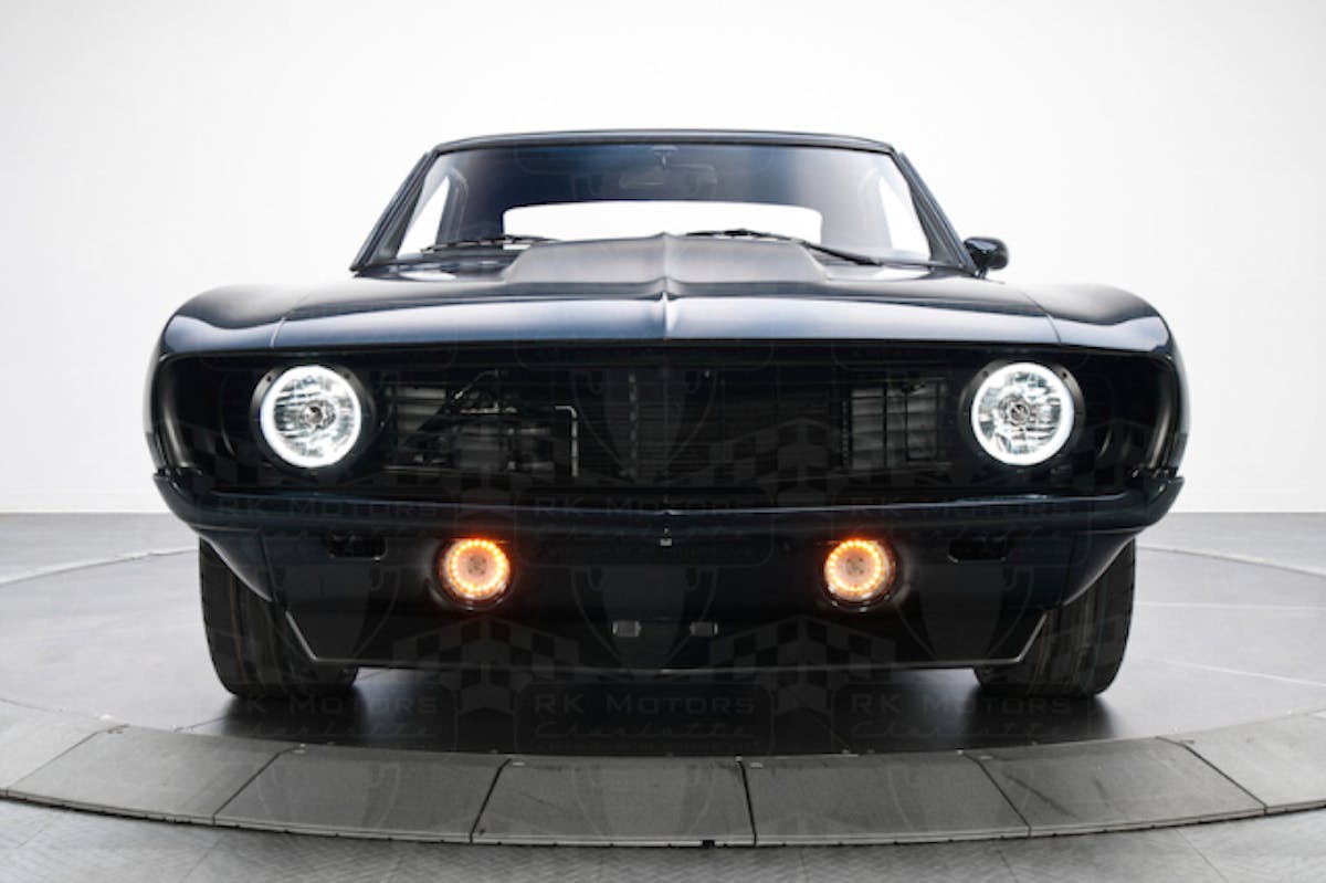 This Camaro isn’t just another LS engine swap project car either. In addition to the manicured body work, the RK Motors crew installed flush fit bumpers on the front and back with a satin black grille and vintage 1970 D80 chin spoiler. A two-tone, cowl induction hood, new windshield framed in satin black trim, and body-matched drip rails add to the show car details.