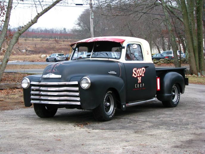The exterior is clearly a post war Chevy Advance Design truck with the down turn door handles, vented windows in the doors and the two-piece windshield with center divided strip in the middle. It’s a look that caused us to stop and check this beauty out.
