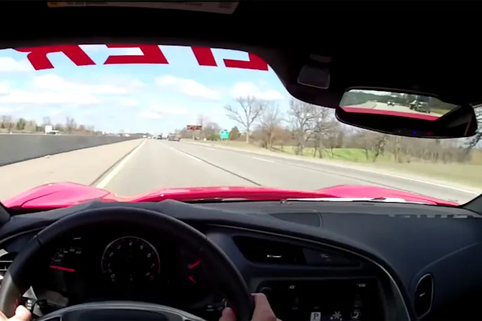 The car has also been modified with a set of Kooks headers, a set of Lingenfelter/Forgeline wheels wrapped in new Continental tires. The Torch Red exterior simply screams “Hi Officer!”, and the driver takes his best shot at trying to attract one. The on-ramp acceleration and grip of the car is on full display as the driver does his best to navigate traffic, by simply watching it disappear in the rearview mirror.