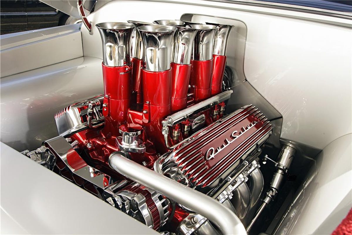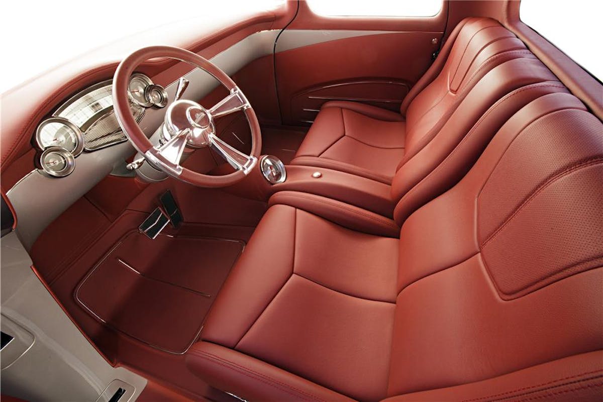 You’d be hard-pressed to find a single part on this 1950 Chevrolet 3100 pickup that has not been customized. If you like the look, the exterior is Radiant Silver and Greystone Metallic paint and the original bumpers were reshaped, narrowed, and refitted to the truck. The body sits on a red, powdercoated Total Cost Involved chassis with a four-link rear, Ridetech coilovers, and Currie 9-inch rearend with a Detroit Truetrac differential. It’s powered by a 500 horsepower Chevrolet Performance LS3 crate engine with 4L65E automatic transmission.