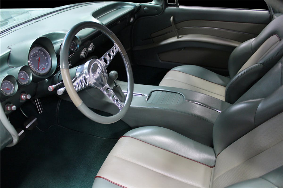 It has a Vintage Air, polished front-runner accessory drive and air conditioning. The dash was sectioned and fitted with billet air vents, Classic Instruments All-American gauges, and an Ididit tilt-steering column with Billet Specialties leather-wrapped steering wheel. The seats are covered with Italian leather with suede accents. It rides on 20 and 22-inch XIX wheels wrapped in Pirelli P-Zero tires. Wilwood four-piston drilled and slotted disc brakes bring things to a halt.