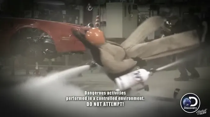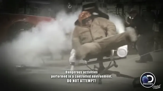 Notice that they have also strung some trailer tie-downs across the garage floor to keep the chair in place—could have gone worse we suppose. AZN wisely puts on a helmet and straps in. Now, since this is on TV, everyone here in the office assumed that they had used TV magic to replace AZN with a dummy/rag doll. That was, until they show the slow motion of him hanging on for dear life.