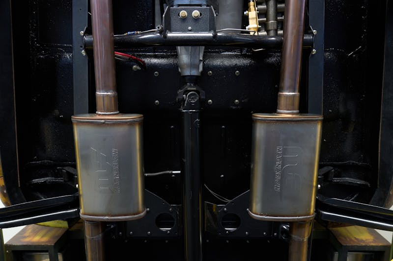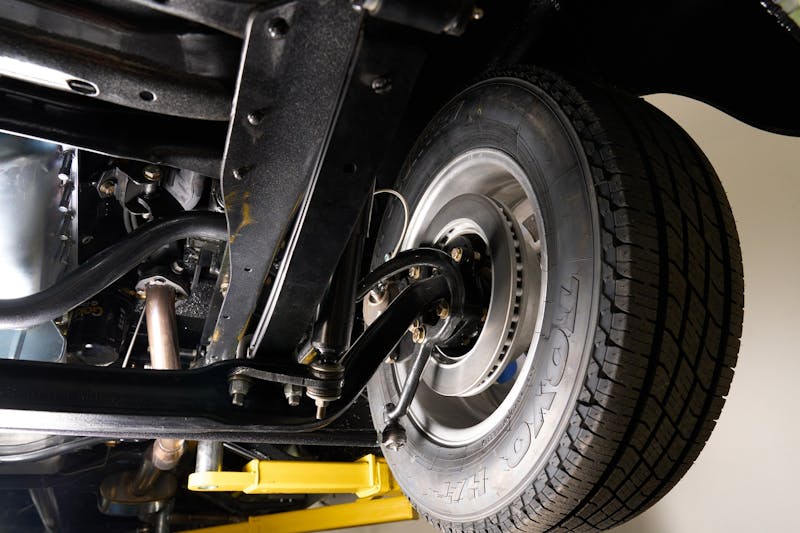 The truck rolls on six polished Ultra Wheel Modular dually wheels wrapped in 235/65R17 Toyo Open Country C/T tires. The modified front suspension features a Nostalgia Sid’s 4-inch dropped axle kit and ventilated disc brakes with braided stainless-steel lines. The rear features a {link=https://www.totalcostinvolved.com/}TCI{/link} four-link suspension kit with coilovers.