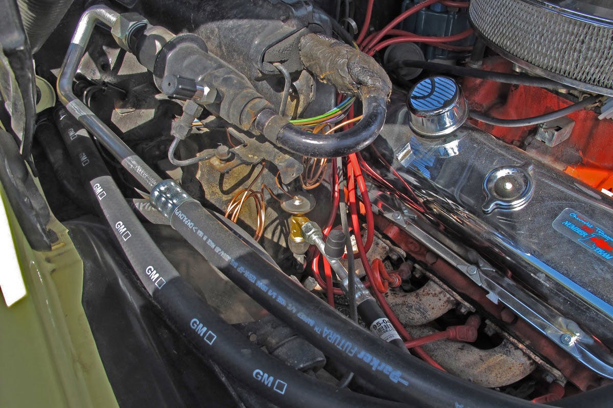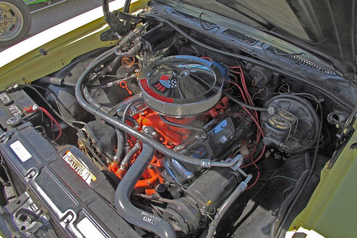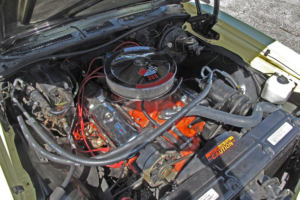 Sometime during its life, the car was repainted, and the black vinyl top was removed. The original, low-mileage 396 cubic-inch engine is backed by a Turbo 400 transmission, and 3.73 gears fill the 12-bolt rearend. The factory front disc-brakes and rear drums bring it to a halt, and finally, the car was apparently raced at some point, as there is a driveshaft loop installed under the floor.