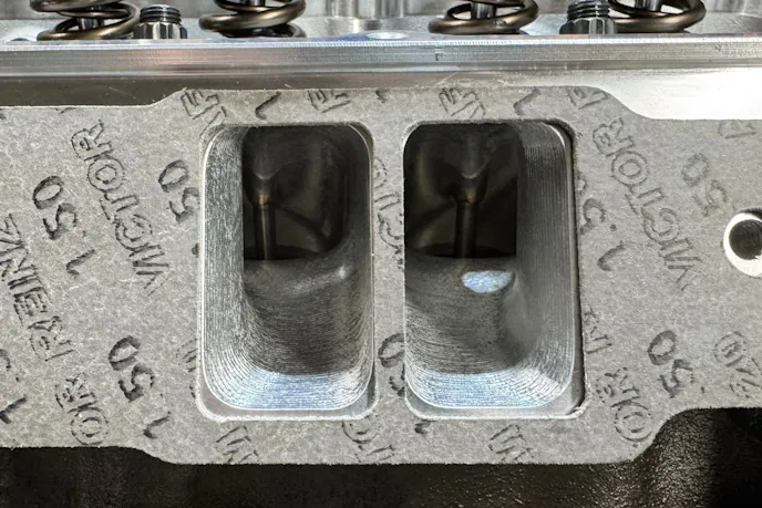 Once the heads were torqued, we installed Cometic intake gaskets, P/N C15614-059. These gaskets have ports measuring 1.310 by 2.210 inches, which match the AFR intake port openings and the 4810 Eliminator manifold that AFR has ported to fit our heads. Matching gasket size to port shape prevents material from intruding into the airflow path, which is especially important for a smaller engine that relies on velocity.