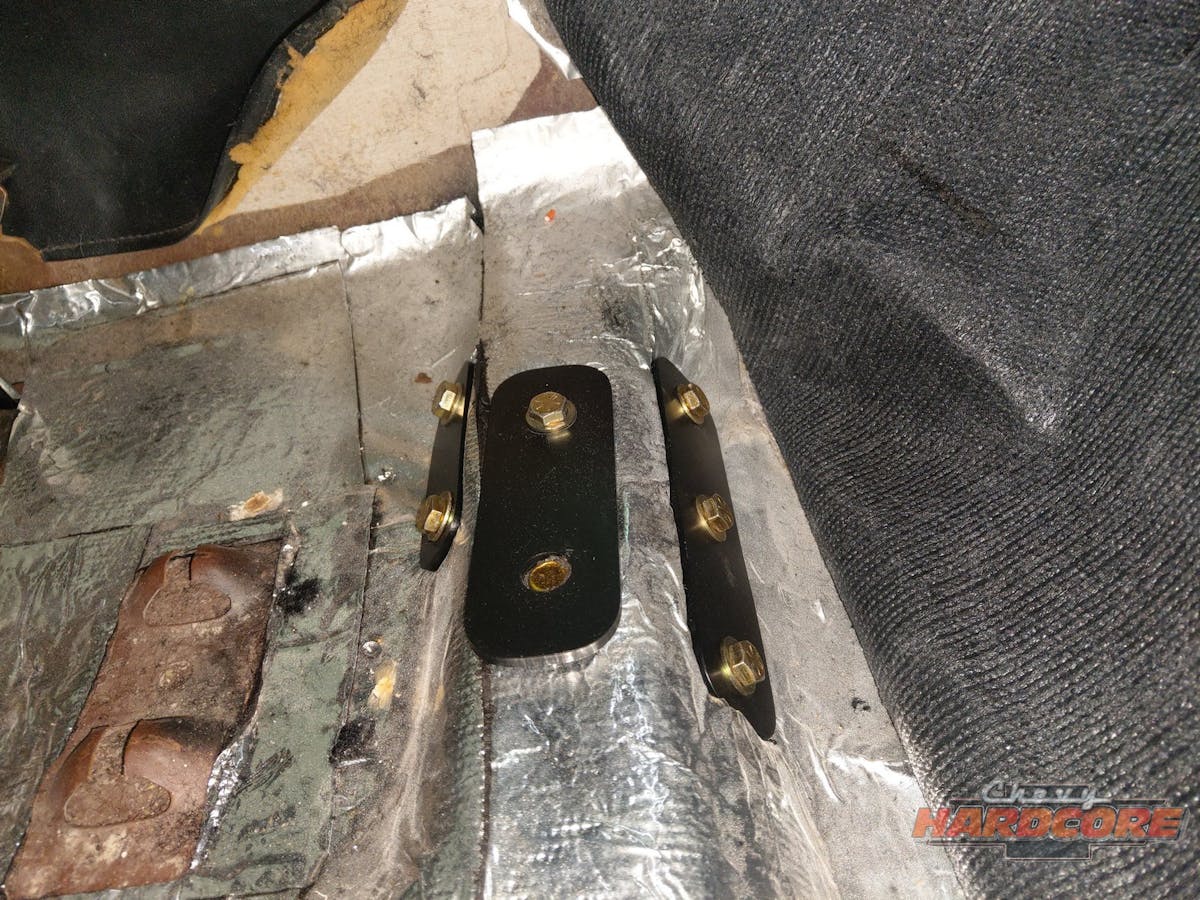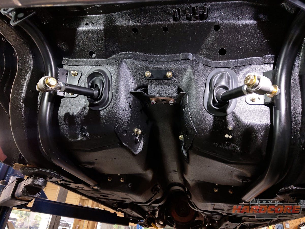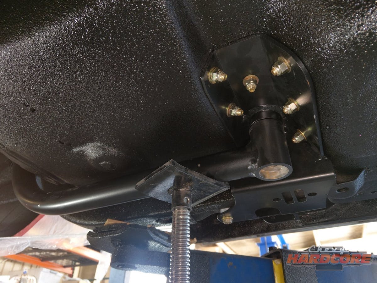 RideTech engineered this interior brace that bolts to both the bulkhead and the rear edge of the transmission tunnel to allow the end user the ability to retain a rear seat. Holes are cut into the bulkhead to allow the upper four-link bars access to the inner Ridetech brace without any welding to the car’s unibody structure.