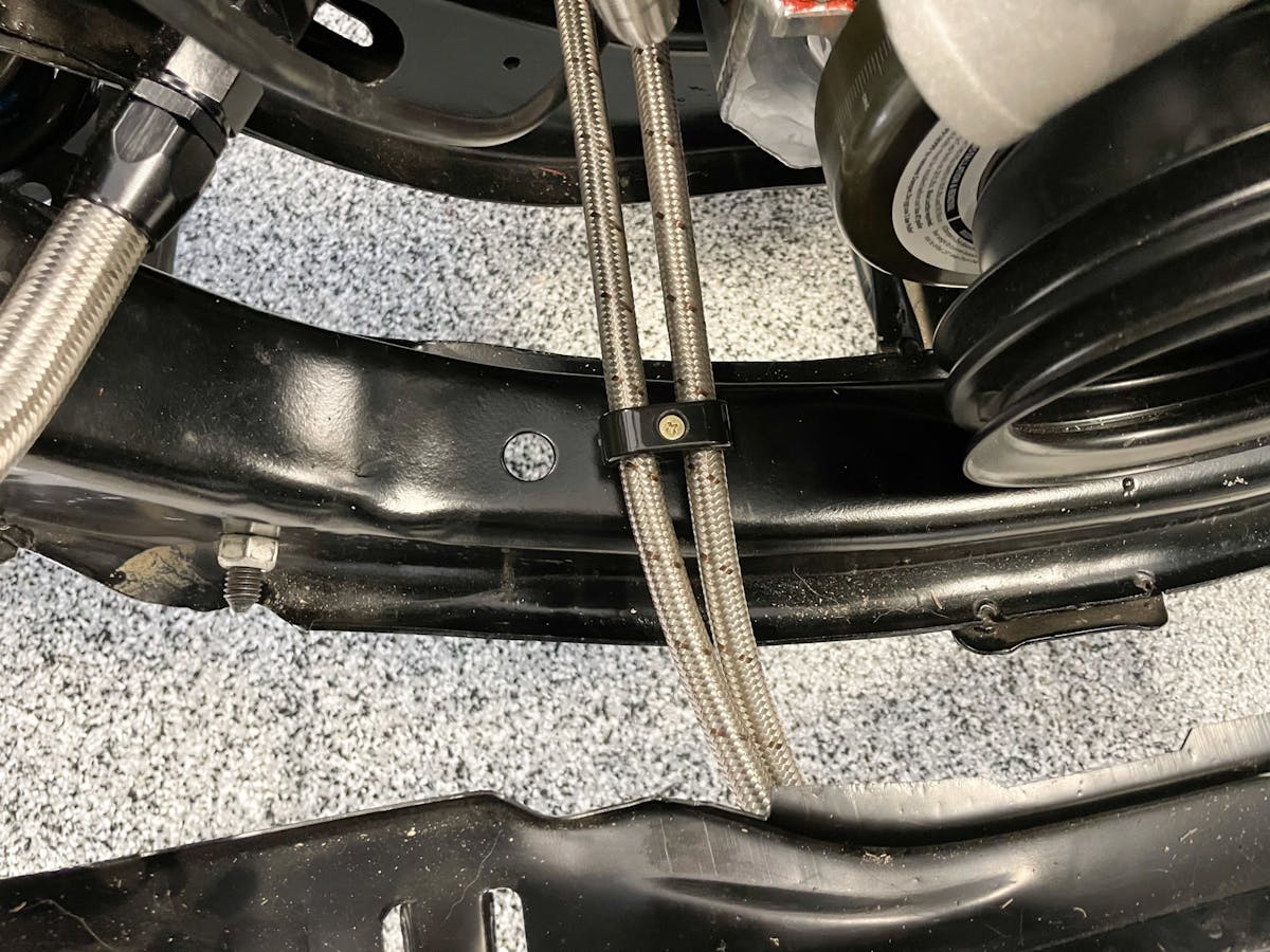 When figuring out the routing of the lines, the first thing to do is dummy up the hoses and fittings required for the application. Keep in mind, bent tube AN fittings aren’t the smallest items in the world. Neither is the bend radius mandated by straight hose end/hose combinations, particularly in larger sizes. Nonetheless, either use a partial hose/hose end combination installed on each of the cooler inlet and outlet ports when you simulate the installation. In this situation, we determined how to snake the cooler lines into place, then we marked the ends for fitting installation. Locations for clamping/supporting hoses are important too. It takes a bit of time to determine the hose routing and to figure out the required length.