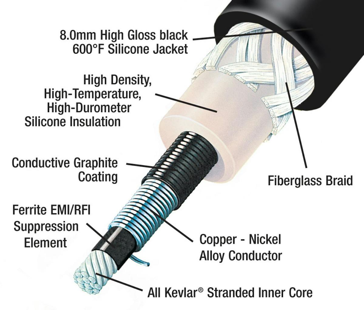 Almost all plug wires are constructed using similar components: a central core, conductive suppression layer insulator, fiberglass braid, and an outer silicone jacket. The center core of OEM-type spark plug wires is made of a carbon fiber that helps minimize radio frequency interference (RFI). However, carbon fibers are not great conductors of electricity and develop a strong resistance to current flow in the plug wire’s ability to carry the electrical current. This reduces the amount of electrical charge that can be delivered to the spark plug. The purpose of this resistance in the plug wires is to help suppress electrical interference with other electronic components in the car. However, the resistance must not be enough to hinder the spark from traveling to the spark plug.