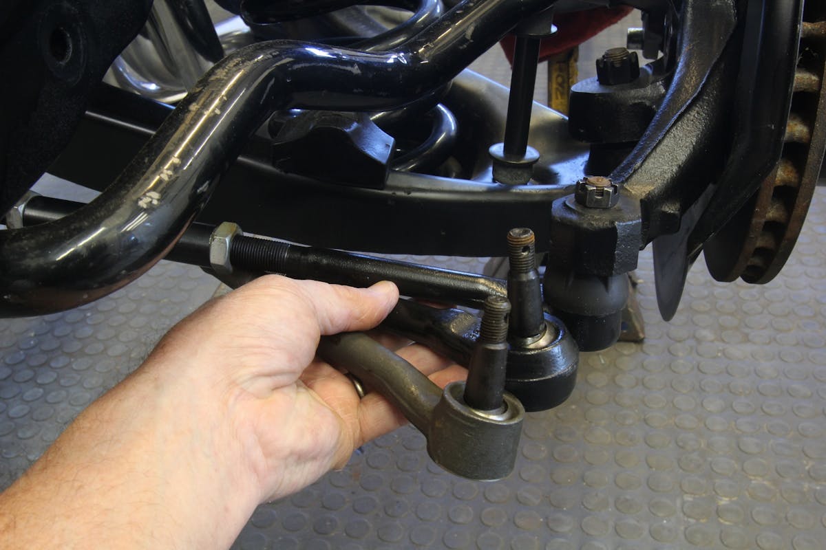 Another important consideration when changing to the taller spindles is that the integrated steering arms require different tie rod ends. The ’78-’81 G-body (Monte Carlo) or ’83-’94 S-10 truck outer tie-rod ends are an excellent substitute. Thankfully, the sleeve adjuster size is the same, so the new tie rod ends will bolt right in place.