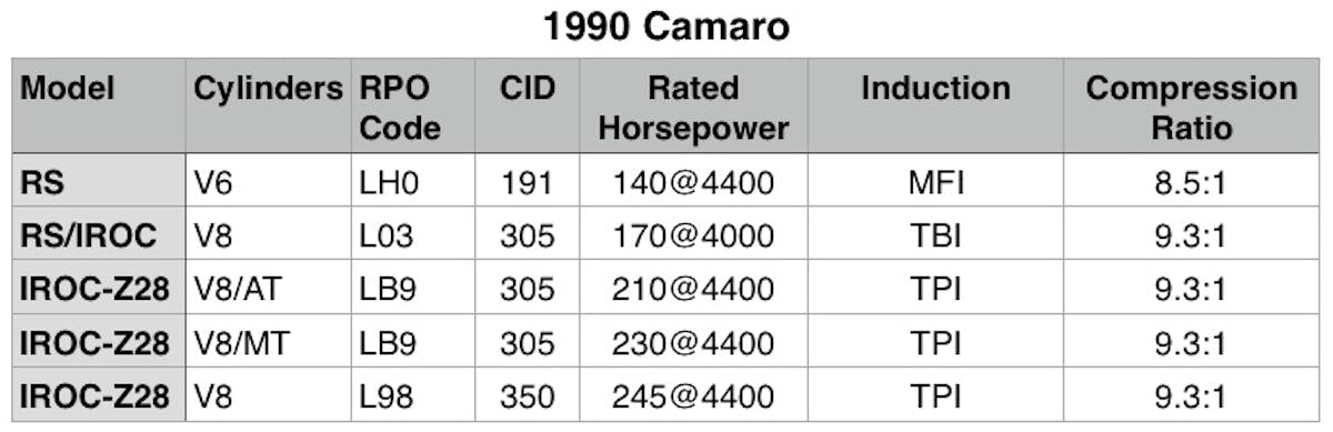 Camaros in IROC-Z trim that were equipped with the 5.7 TPI engine received a slight horsepower increase to 245 at 4,400 rpm. The RS base-engine was changed to the LH0 V6, upgrading from the 2.8 LB8 to the 3.1 LH0.