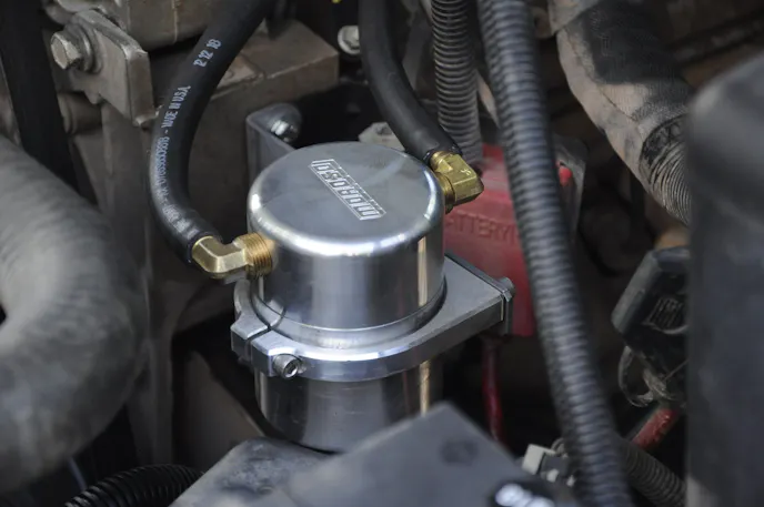 The Moroso Air/Oil separator is sometimes mistakenly called the catch can. A regular catch can simply traps the oil and keeps it out of the intake. However, these units are generally open to the atmosphere and cause issues like an oily engine compartment or an oil smell when the air conditioner comes on. The bigger problem is the fact that they are not EPA-compliant and usually bypass the PCV (Positive Crankcase Ventilation) system.