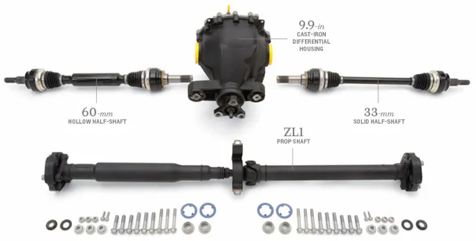 Chevy Performance’s Camaro ZL1 HD Driveline Kit is the strongest independent rear axle option for the Camaro from the factory. Available for both manual (part number 22959394) and automatic transmissions (part number 22959395), the upgrade kit includes a massive cast iron center section that houses the large 9.9-inch limited-slip differential, heavy duty asymmetrical half-shafts, and a stronger driveshaft, or prop-shaft as some may call it.