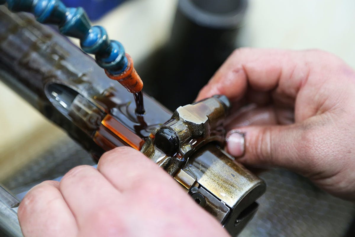 This enhanced process begins with a round bar of 4340-steel that is placed in an induction furnace. The round bar is pushed through a roller press that forms the steel into what looks like a weightlifter’s dumbbell with large and small ends.