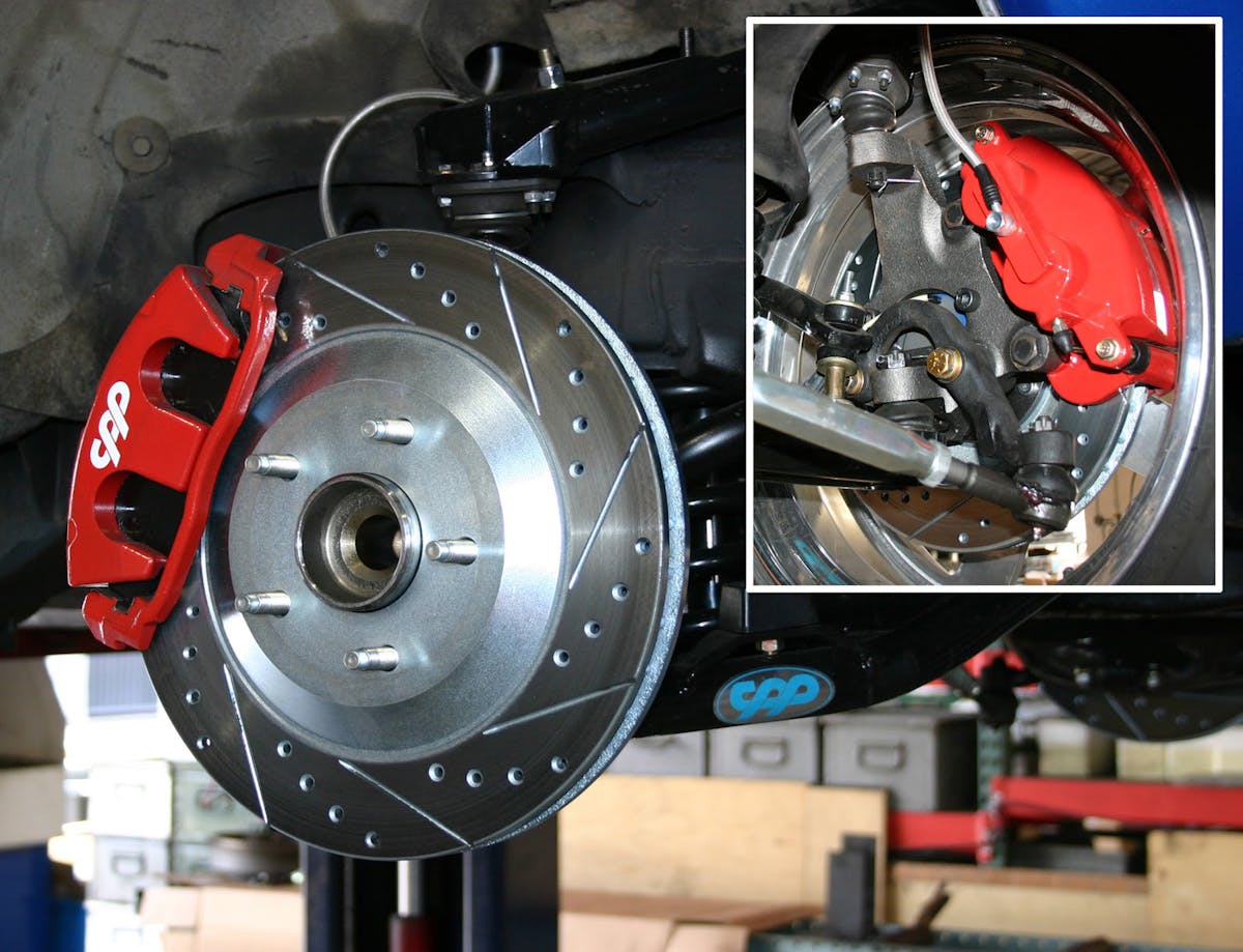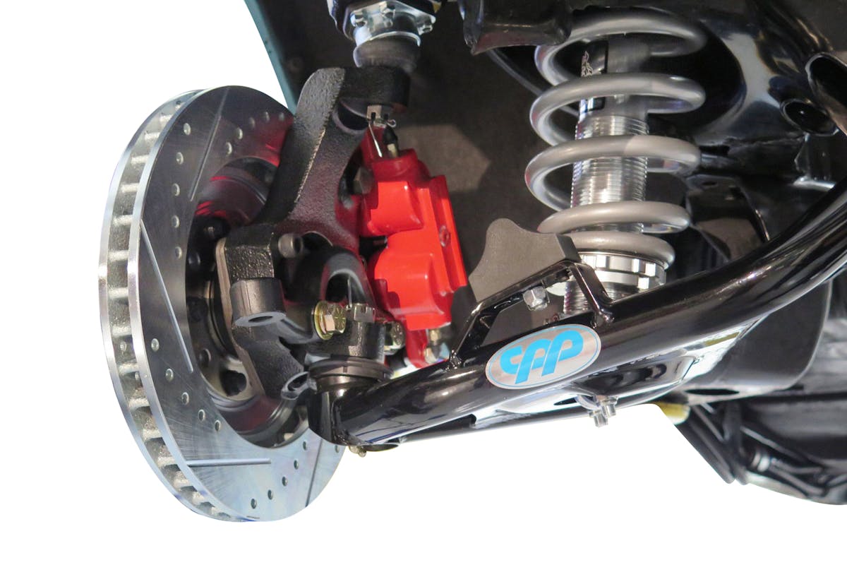 If you are wondering if there are any specific fitment options or areas to consider, the primary fitment concern is allowing enough space in the wheel for larger calipers. CPP has developed each of these kits so the company’s base brake kit will work. However, using larger diameter rotors and larger caliper bodies can become challenging. For example: a six-piston caliper from a C6 Corvette is 12 inches high when mounted, placing the caliper several inches higher than with any vintage OE spindle. When installing the CPP spindle and subsequent brake assembly, you would need to be careful about fitting this caliper between the upper and lower control arms, and insure adequate clearance throughout the full range of steering and suspension travel.