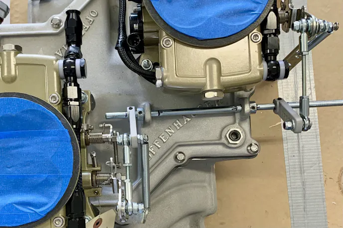 The foundation for this install is that iconic Offenhauser cross-ram intake. The Offenhauser low-profile, dual-ram intake base, Offenhauser low-profile, dual-quad top plate, and throttle linkage are available as a kit from FiTech (PN: 92200). To make the EFI conversion as simple as possible, we ordered the entire 2×4 EFI conversion kit (PN: 92211), which includes FiTech’s 500-horsepower, dual-throttle-body system along with the upper and lower intake sections and linkage. This kit also requires the use of FiTech’s Dual Sync distributor as well. We also opted for great-looking ARP 12-point bolts to hold the intake to the heads, secure each throttle body, as well as mount the dual-quad top plate to the intake base for a super-clean appearance.