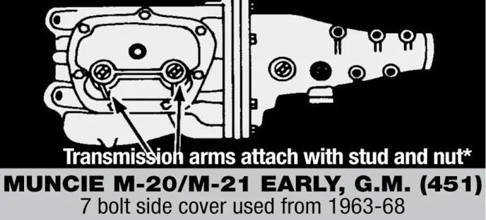 It is easy to determine whether you have an early or later model Muncie four-speed transmission by the way the transmission’s linkage arms are attached. The 1964 through 1968 Muncie side covers had a stud coming out of the side cover that secured the linkage arm via a nut. The 1969 and later models use a bolt to secure the linkage to the transmission.