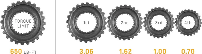 That alone is substantial, but when you also figure in the 4L85-E’s 1.48 second gear vs. the 4L75-E’s 1.62, you can see what we mean. As a side note, the overdrive in the 4L85-E is 0.75, while the 4L75-E is 0.70. Coincidentally, since the difference in gearing did prohibit an even testing platform and when purchased alone, the 4L75-E does not come with a torque converter, Larry installed a torque converter from Yank with a 3,500-stall rating.