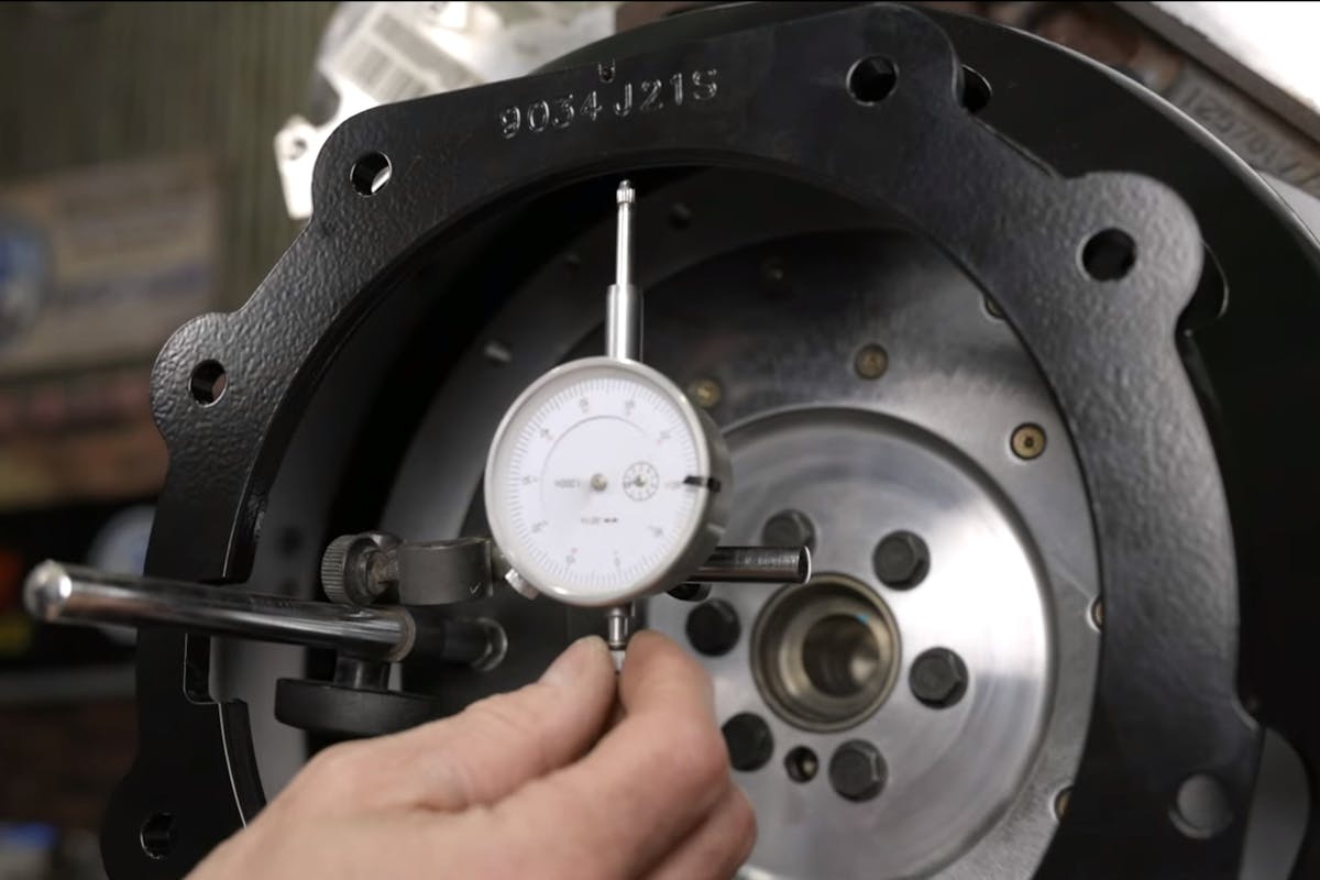 The first thing you’ll need to do is look over the mating surface of the block, transmission, and bellhousing. There could be imperfections on these surfaces that need to be addressed. When the surfaces have been cleaned up, you’ll mount a dial indicator for the indexing process. The dial indicator will then need to be adjusted so the tip is on the center of the bellhousing’s plate. It’s important to make sure the dial indicator is parallel with the bellhousing.