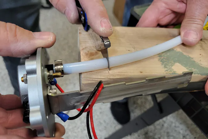 The fuel pressure and return lines are already attached to the pump assembly base. Some simple math, accounting for the length of the fuel pump and sock, was all we needed to get the pump installed. The pre-wired assembly already has the pump wires in place. Once we cut the pump mount to the proper height, we trimmed the excess pump wires and installed new terminals at the pump power supply studs.