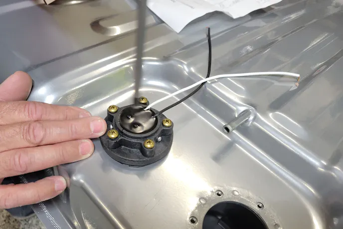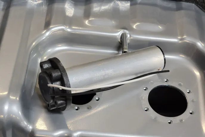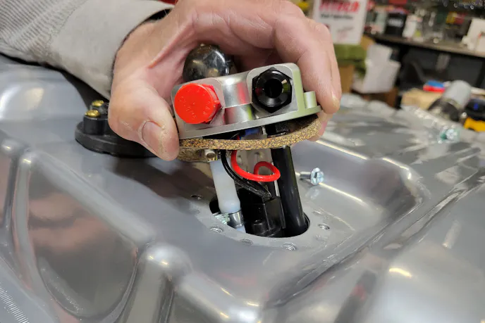 Tanks Inc. can provide GM-style or aftermarket fuel-level sending units that utilize the standard SAE five-hole mounting. We opted for an aftermarket, float-less sending unit. This was ideal for our application because a conventional swing arm unit would not fit due to clearance issues. For our EFI-ready tank, both the fuel pump and fuel level assembly fit down into a tray inside the tank. This design allows fuel to the pump and level sender, yet prevents starvation and inaccurate level readings due to the movement of the fuel while driving.