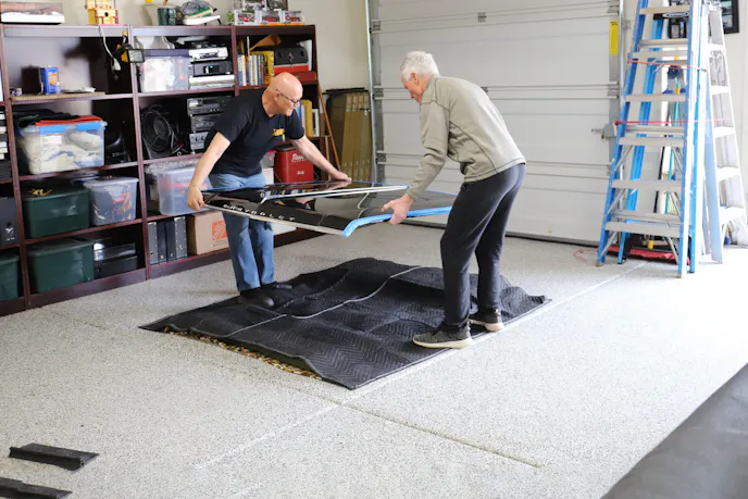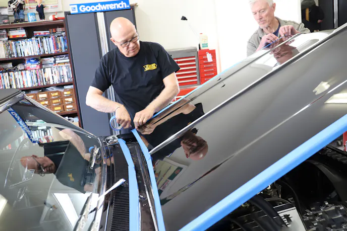 A little bit of prevention is worth more than a ton of buffing compound when you’re dealing with painted surfaces. We began by taping off the perimeter of our hood and the nearby areas on our fenders and cowl with masking tape. Then, we could remove the hood and place it safely out of the way. We wouldn’t even think of trying this without at least two people.
