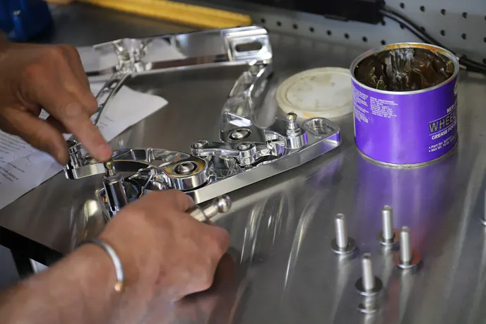 All Eddie Motorsport hood hinges are manufactured from billet 6061-T6 aluminum and are machined at Eddie Motorsports’ facilities in Rancho Cucamonga, California. All the articulating components are suspended by high-quality, sealed ball bearings, allowing incredibly smooth and bind-free operation. Instead of using springs, Eddie Motorsports hinges use nitrogen-filled struts manufactured from stainless steel to support the hood in the open position.