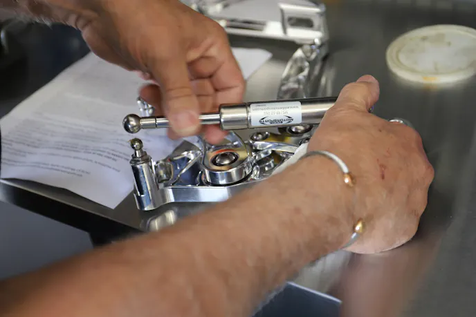 From there, there were only two bolts holding the old hinges in place. We used more masking tape to mark the placement of the old hinges before loosening the bolts that were securing them. With the hinges out of the way, we were almost ready to install the new billet hinges.