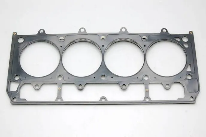 The standard MLS gasket is a three layer, while thicker gaskets (.056 up) are a five-layer build. Micky Hale, Cometic GasketsThe embossing allows for localized sealing, and the way the layers are stacked with each other allows the gasket assembly to have a specific “spring rate.” Since they are built in a layered fashion, they can also be made in various thicknesses that allow the engine builder to adjust the distance between head and deck to tailor for specific compression needs or valvetrain geometry. Check with your gasket manufacturer for availability.