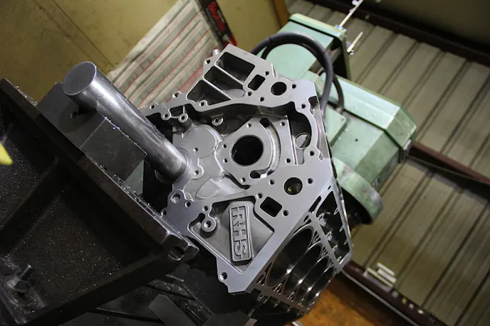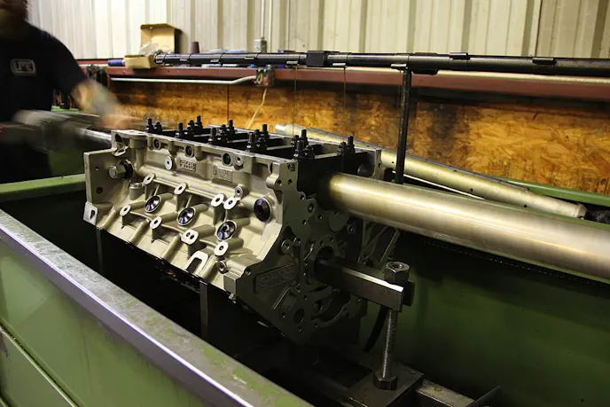 Since the blocks come from RHS bored to size at 4.160-inch, LME merely needed to touch each cylinders block with the hone. For proper piston and ring fit, LME was able to hog out enough material; allowing 0.0037 inches of clearance from each bore. Without punch from each combustion chamber and to raise compression, the deck was cut 0.010-inch, with a final deck height of 9.740-inch.