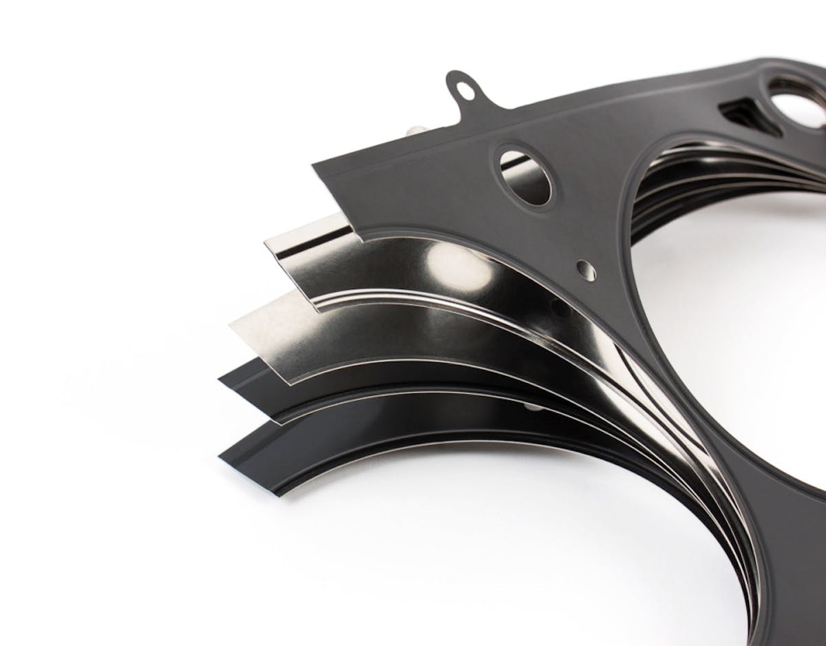 MLS gaskets are designed with two to five sheets of spring or carbon steel sandwiched between the head gasket’s sealing material. Precisely shaped beads and stoppers work with the specific steel properties to increase the clamping force around the combustion chamber.