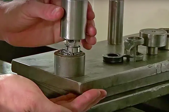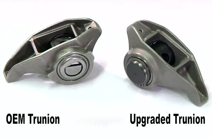 The new trunnion kits install within the factory rocker arm, but use a “caged” needle-bearing housing. In addition to material strength of the cross shaft, the cage adds strength and contains the needle bearings in case of any failure.