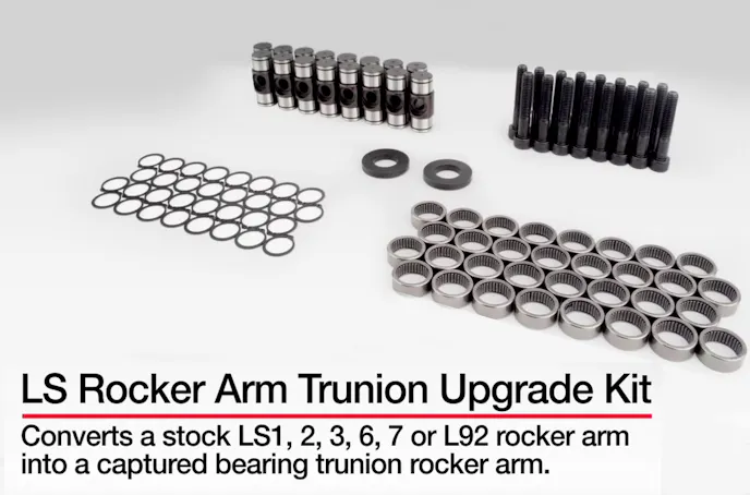 The LS heads use a “roller-trunnion” rocker arm with strength far superior to their stamped-steel ancestors. The needle bearing trunnion is housed within the cast-steel body with a cylindrical pivot on both sides of the rocker arm stud.