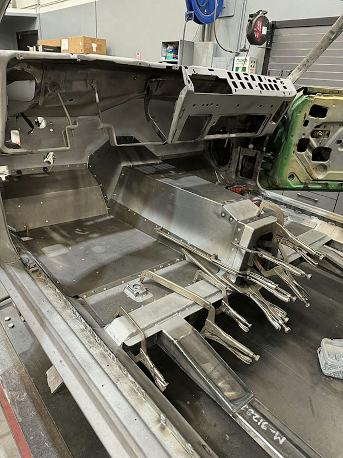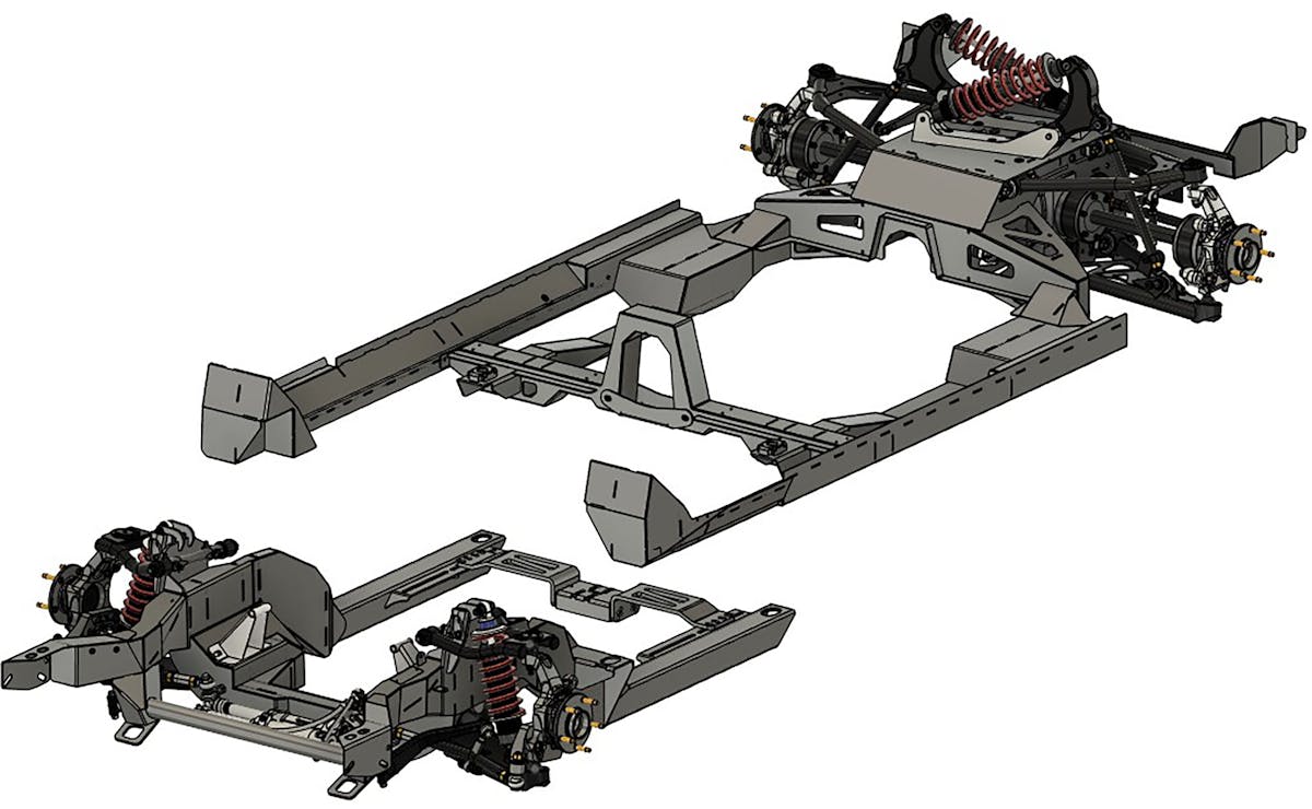The chassis accommodates a variety of drivetrain options, including LS, LT, small-block, and big-block Chevy engines. The fully adjustable transmission crossmember allows the fitment of just about all conceivable engine and transmission combinations. Note that oil pan compatibility is chassis-specific and the pan used must fit around the steering rack.
