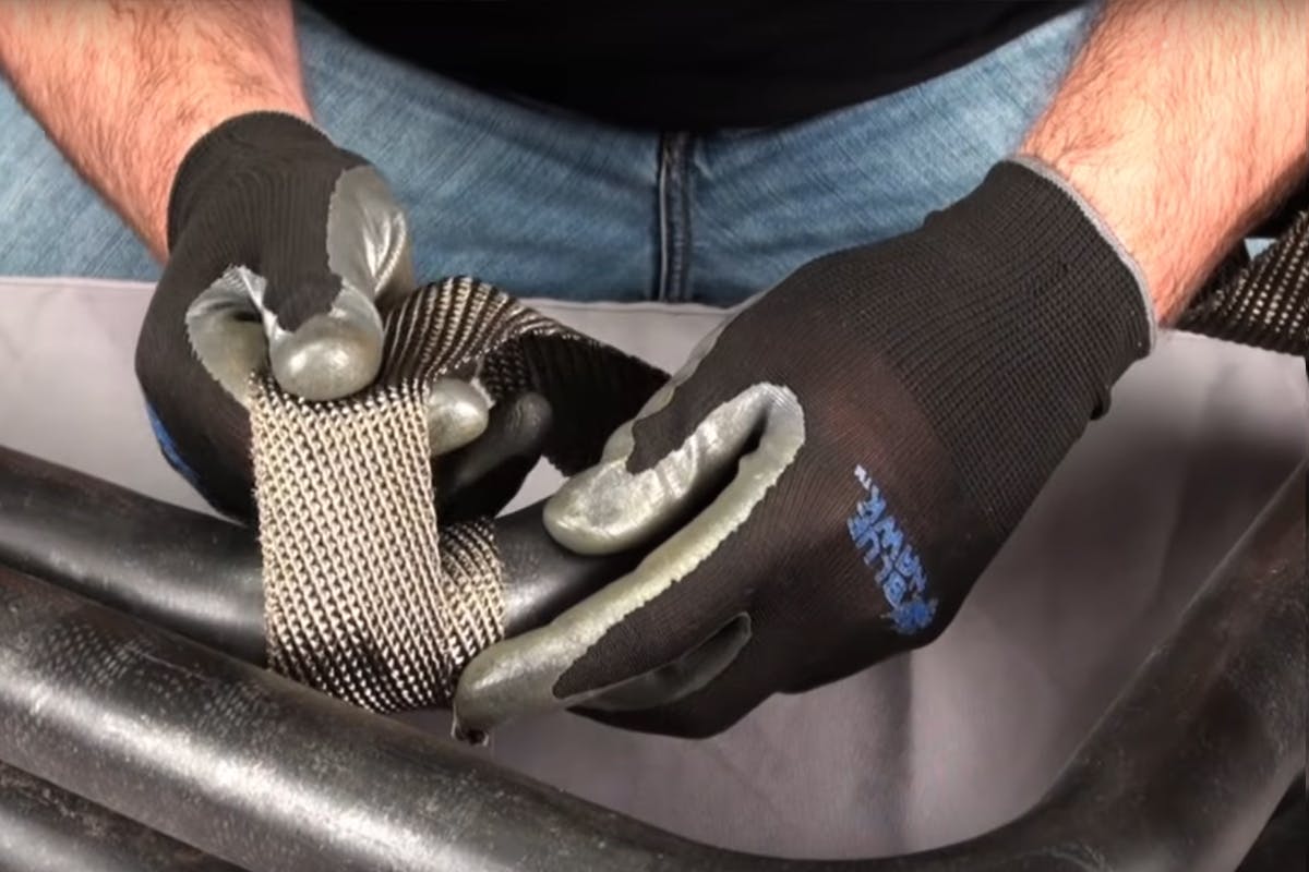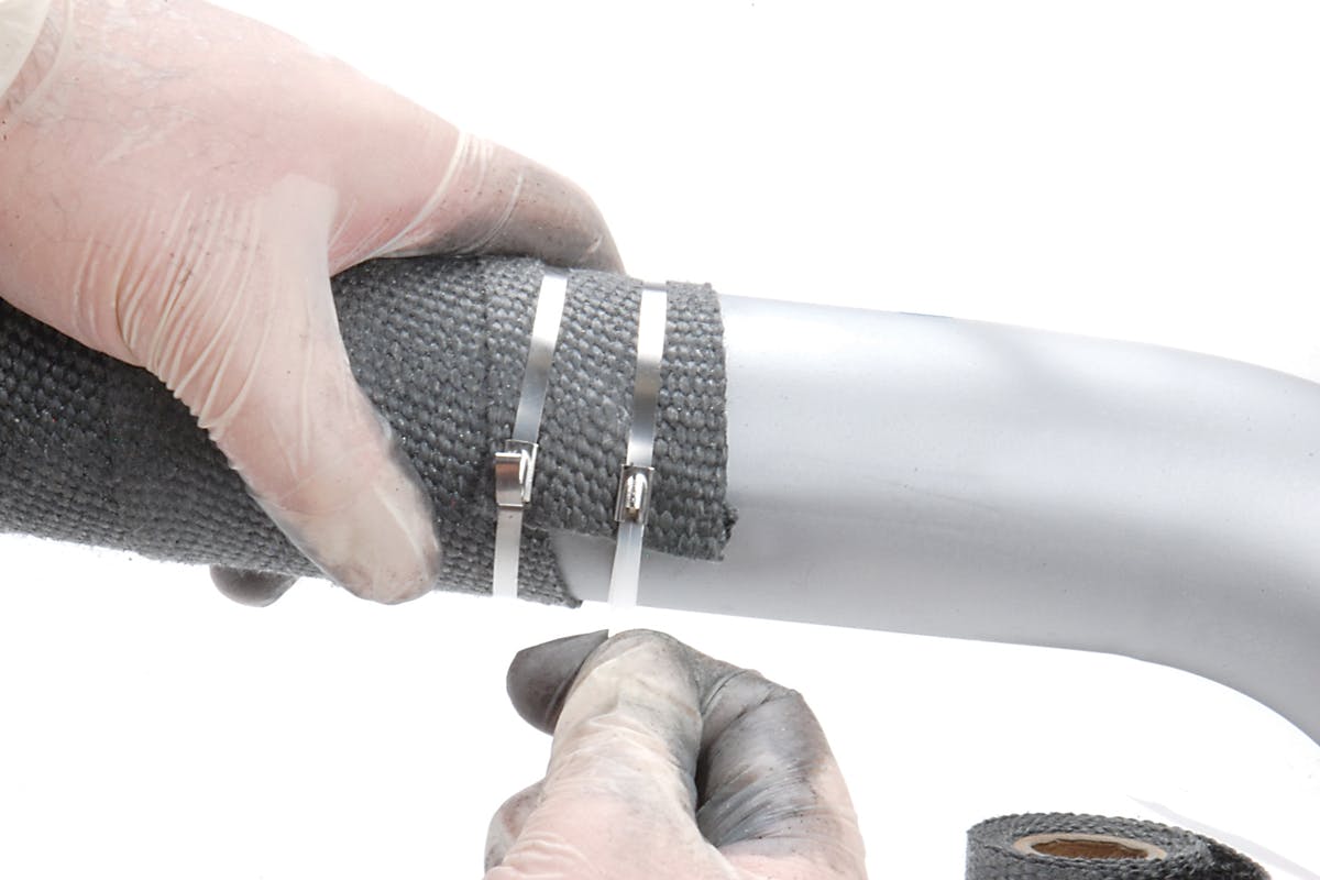 Once you have reached the end of a tube, and are at the collector, the stainless-steel ties will secure the wrap to the header. Remember: if it's slightly loose, then it can unravel, so keep it snug as you wrap the header.