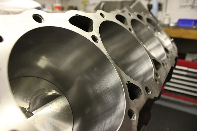 Each block is then align honed, and bored honed to within 0.0002-inch straightness and roundness. Cylinders are then sonic tested for thickness.
