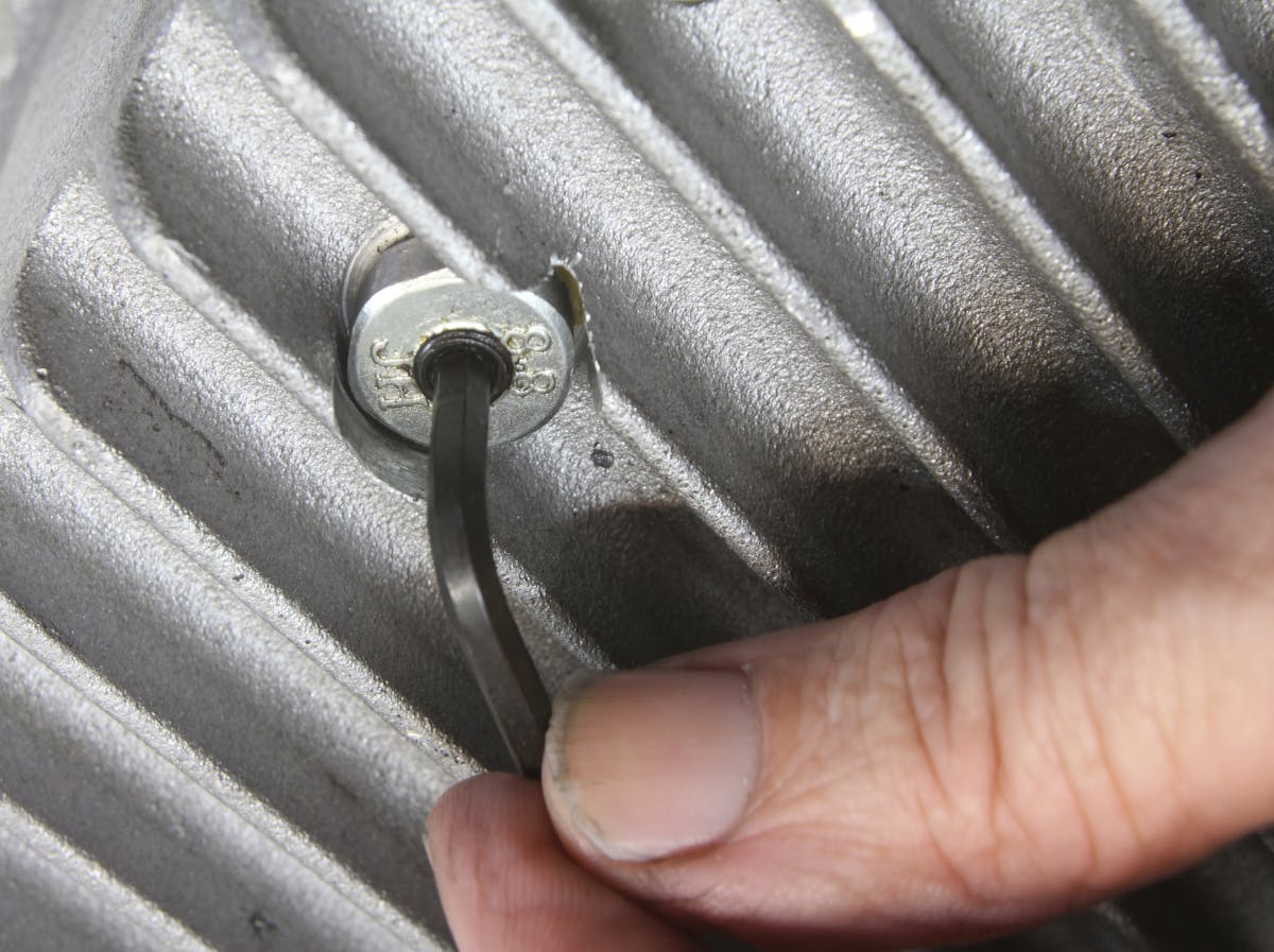 Admittedly, the procedure for checking fluid level is a bit more cumbersome than using a dipstick, but it is far more accurate. If we are dealing with a new transmission, start by removing the small Allen fitting in the drain plug. Then, with the engine off, fill the pan with ATF until oil runs out of the plug. It’s best to use a drain pan to catch any errant oil.