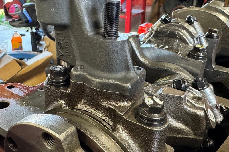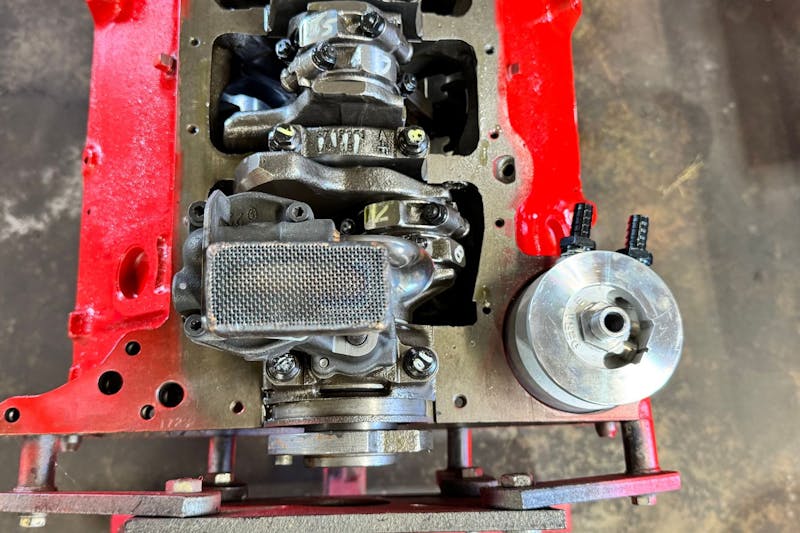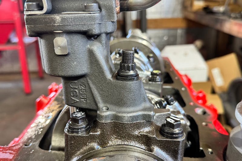 We mounted the pump using Moroso’s oil pump stud kit (P/N 38150). It’s a small part, but one that improves assembly confidence. “The stud and nut combo tends to draw down more evenly when tightening versus running a bolt in, and can accommodate different pump castings more easily,” Corriveau told us. Studs help ensure even clamping force, reduce thread wear in the block, and simplify servicing down the road. They also make future teardown and inspection easier, especially when dealing with iron blocks that can wear over time.