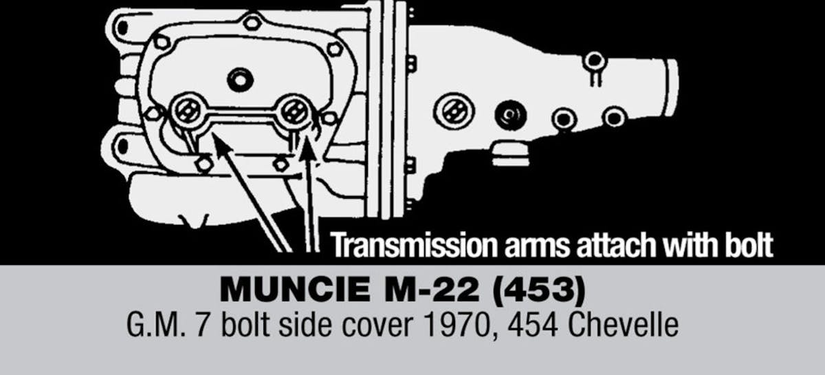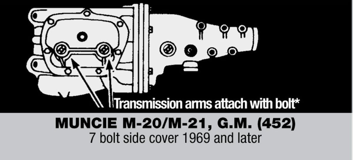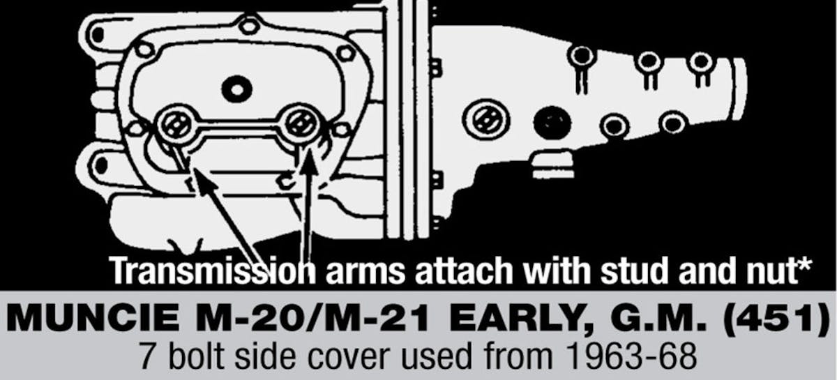 It is easy to determine whether you have an early or later model Muncie four-speed transmission by the way the transmission’s linkage arms are attached. The 1964 through 1968 Muncie side covers had a stud coming out of the side cover that secured the linkage arm via a nut. The 1969 and later models use a bolt to secure the linkage to the transmission.