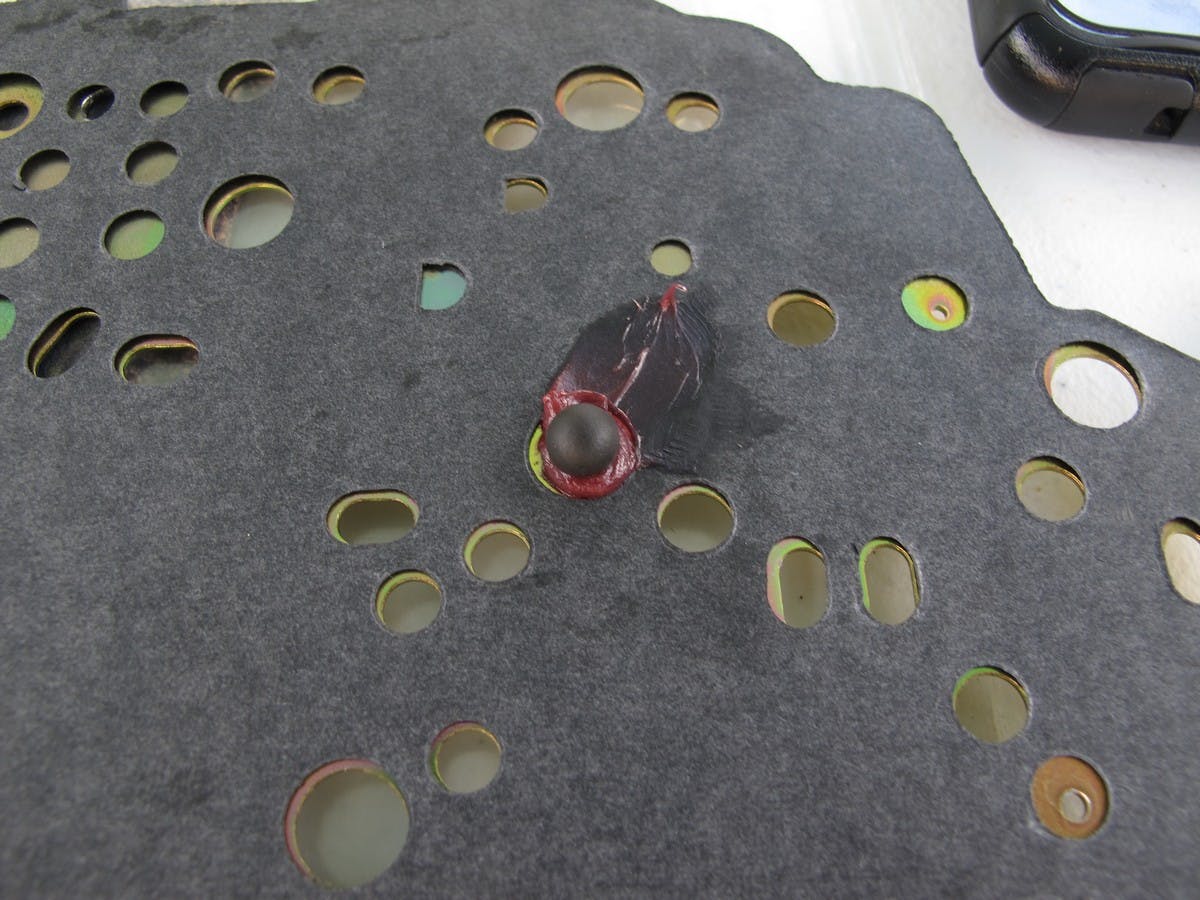 Now, install the upper valve body gasket on the case side of the separator plate. You can use a small amount of grease to hold it in place, and then install the lower valve body gasket (identified by the Z-shaped slot) in position on the valve body side of the separator plate. Again, a small amount of grease will hold it in place. I also dabbed a small dollop, glob, or whatever you want to call it to hold the check ball to the gasket/plate assembly while I reinstalled it. A pan bolt can be used to temporarily hold the gasket/plate assembly in place after positioning it.