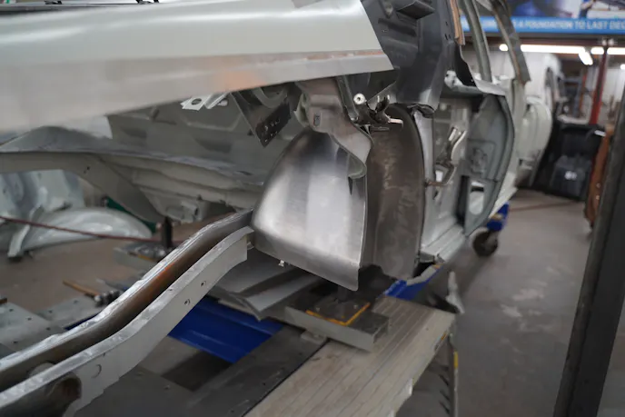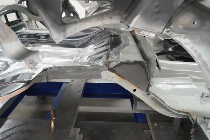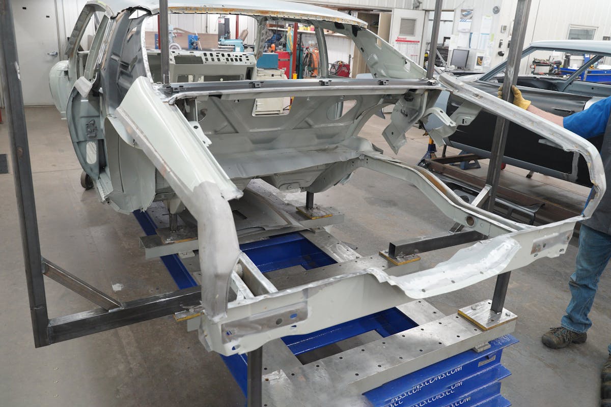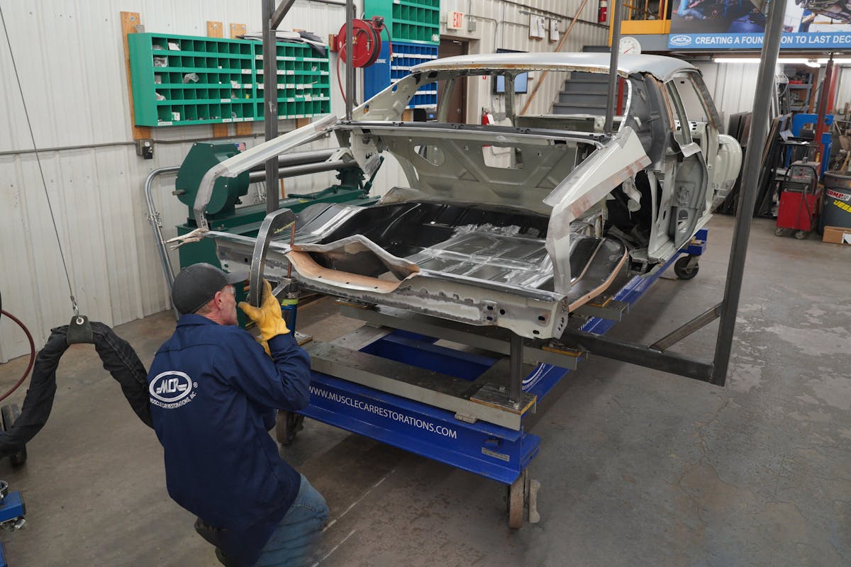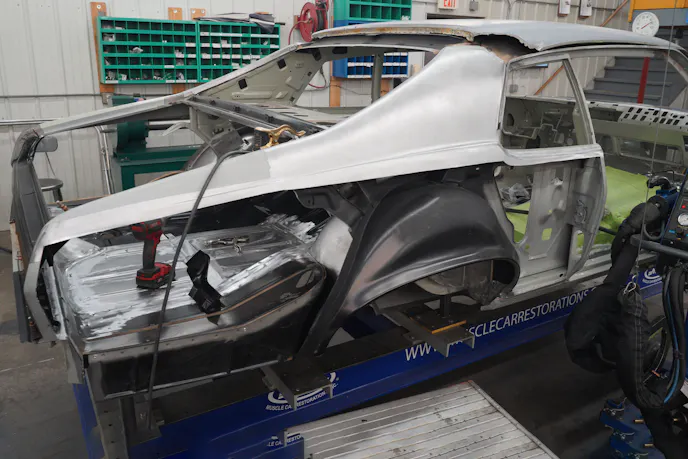 Cutting a car apart to this level severely weakens the entire structure, and the MCR team carefully placed the body into a jig to preserve the dimensions as much as possible. You’ll also note that the upper portion of the quarter panel still surrounds the trunk opening. There are a few reasons for this, but this is done whenever possible to give the rear section of the body added strength and preserve the trunk opening dimension during the rebuilding process.