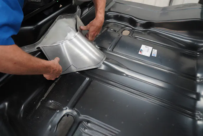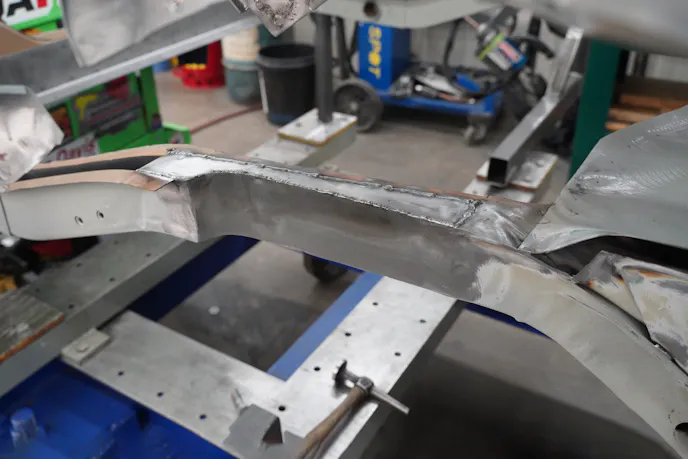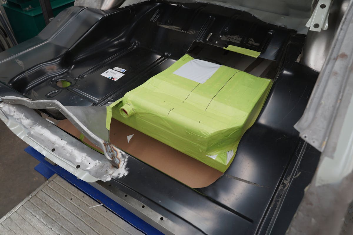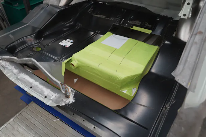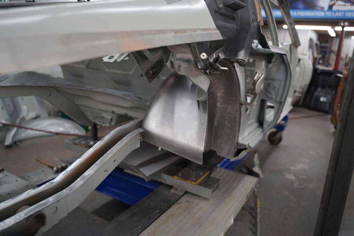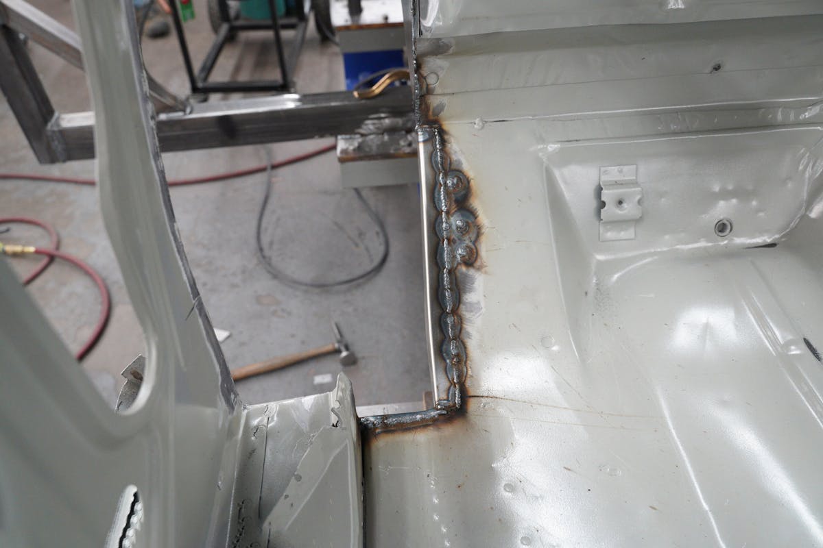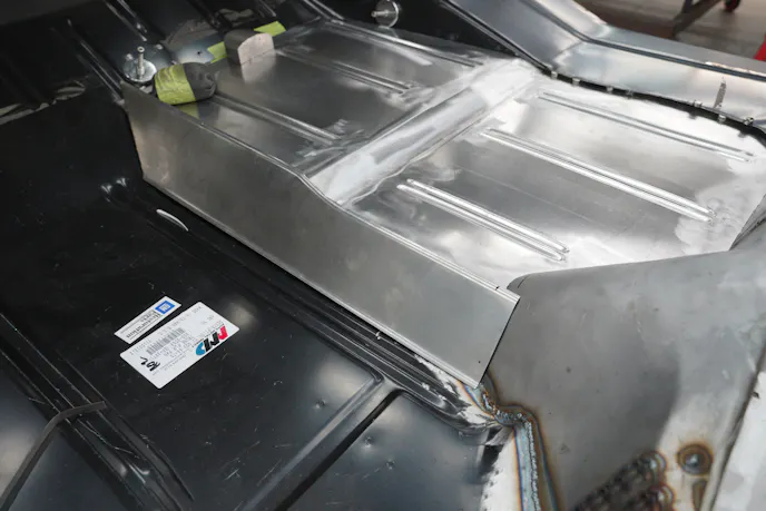 The floor needed to be raised to allow for the fuel tank. Likewise, the mount for the fuel strap needed to be reattached to the modified portion to help hold the tank in place. The MCR bodywork team makes the fabrication process look easy, but years of experience, patience, and the proper tools are all necessary to get this level of workmanship.