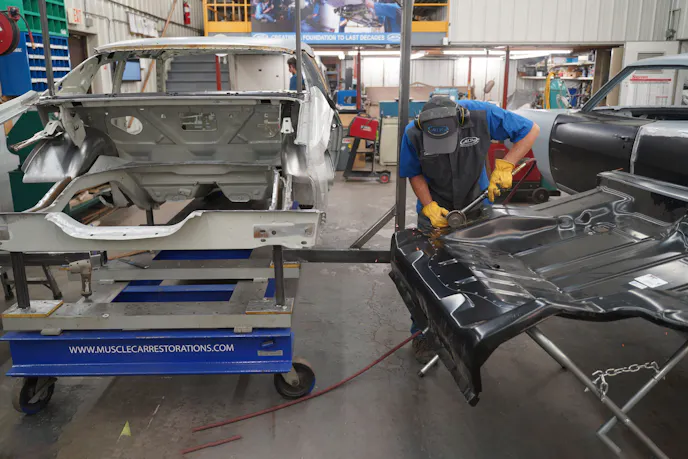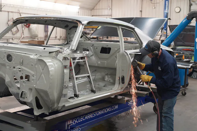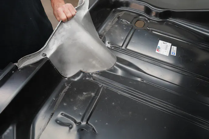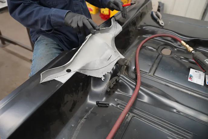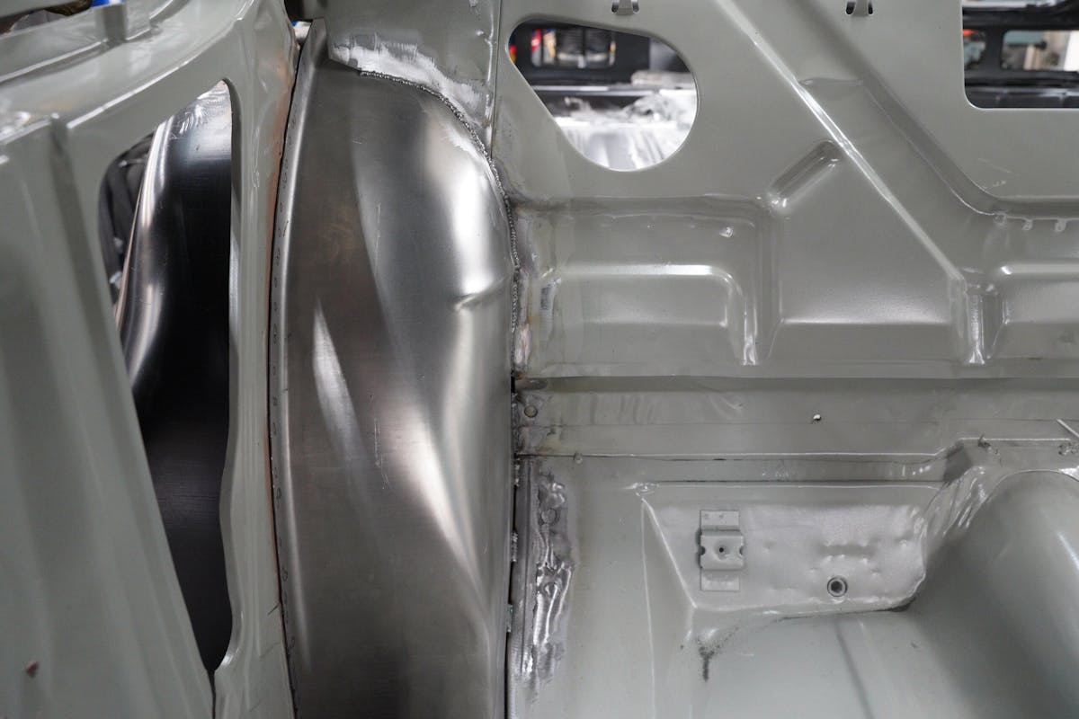 As with the trunk floor, full quarter panels are no longer available, but the MCR team has devised a clever way to just about remove any evidence of a seam. As with all the trimming done on the body once the rust was removed, the team makes very precise cuts, as it’s easier to grind a little bit away than to add metal.