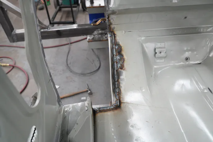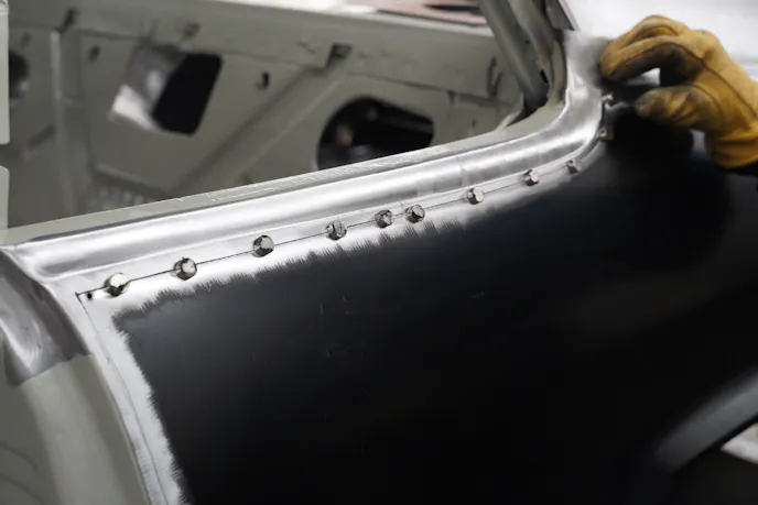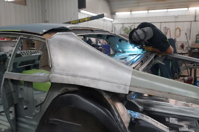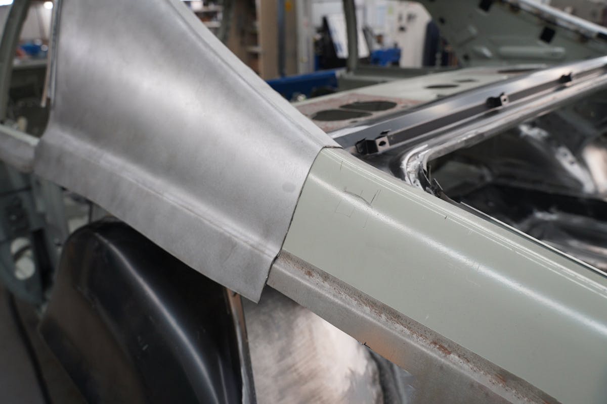 The repurposed sail panels were installed first. They came from the same vehicle that donated the new roof, but required some “extensive work” to be usable once again on this project. The sail panels mate with the remaining OEM quarter sections and reach up to the factory seam area with the roof when it is installed.