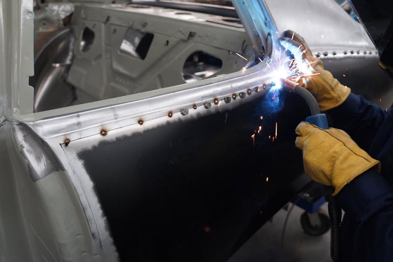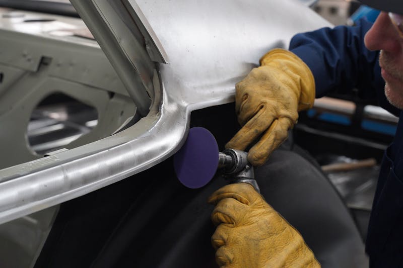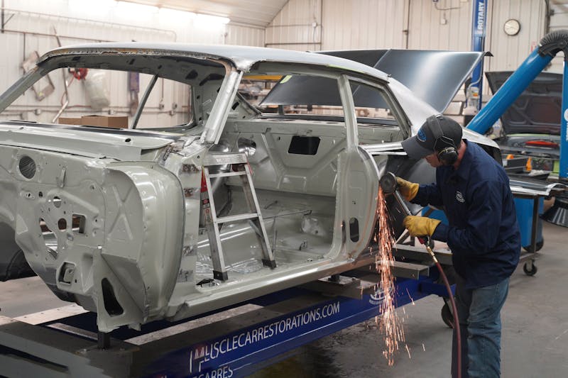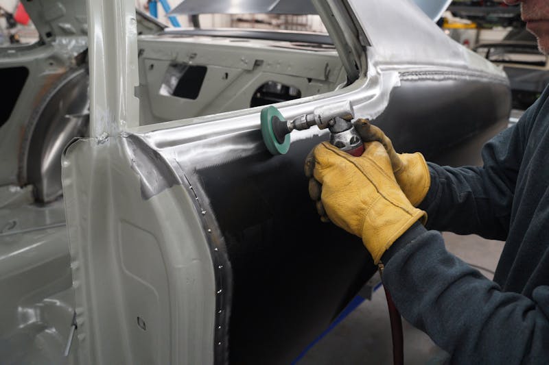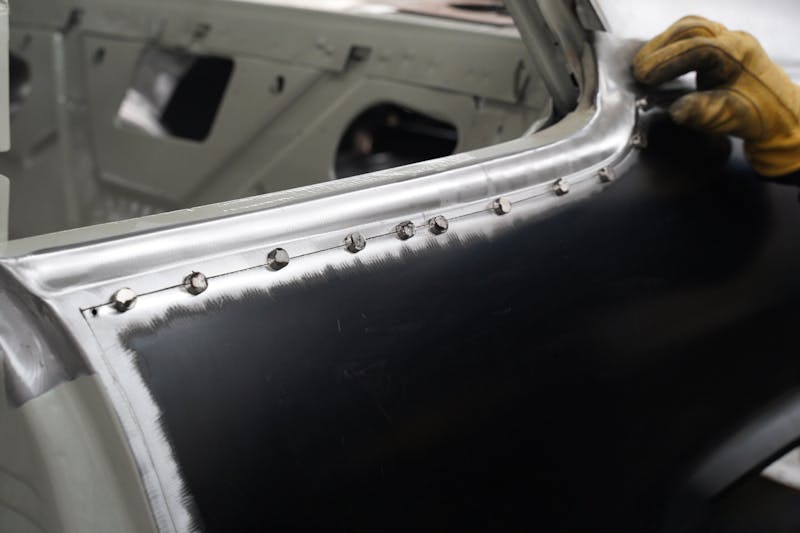 After everything is checked for proper fitment, the MCR artisans use a variety of welds to join the new floor to the body. The trimmed front of the floor is button-welded, and then the seam is stitch-welded to seal everything. MCR also uses spot-welders when possible to replicate how the body panels were joined at the assembly plant.